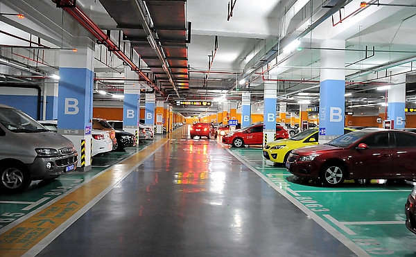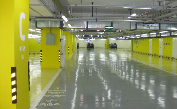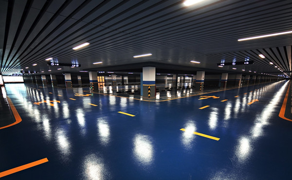 綠色的地坪漆的停車位,淺灰似得的過道,還有那藍色和橙色的墻面來區分著車位廠區,跳動的色彩,不那么單調