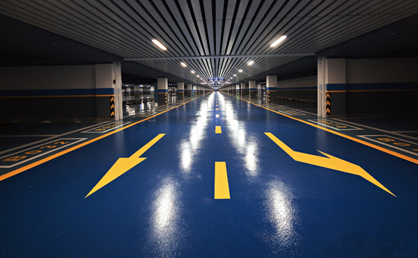 藍色的地坪漆鋪設在大面積的停車場上,充滿著海洋的動感,大海的深沉;鮮艷的黃色地坪漆涂刷在藍色之上,鮮艷、醒目,充滿著活力,年輕之感,引導著車主有明確的方向。